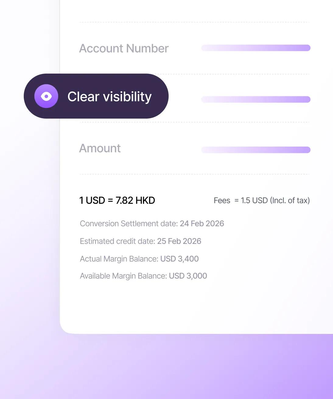 Access competitive FX rates in HKD and major currencies with full transparency on fees and margins. Every transaction is clearly priced, so you know precisely what your beneficiary will receive.