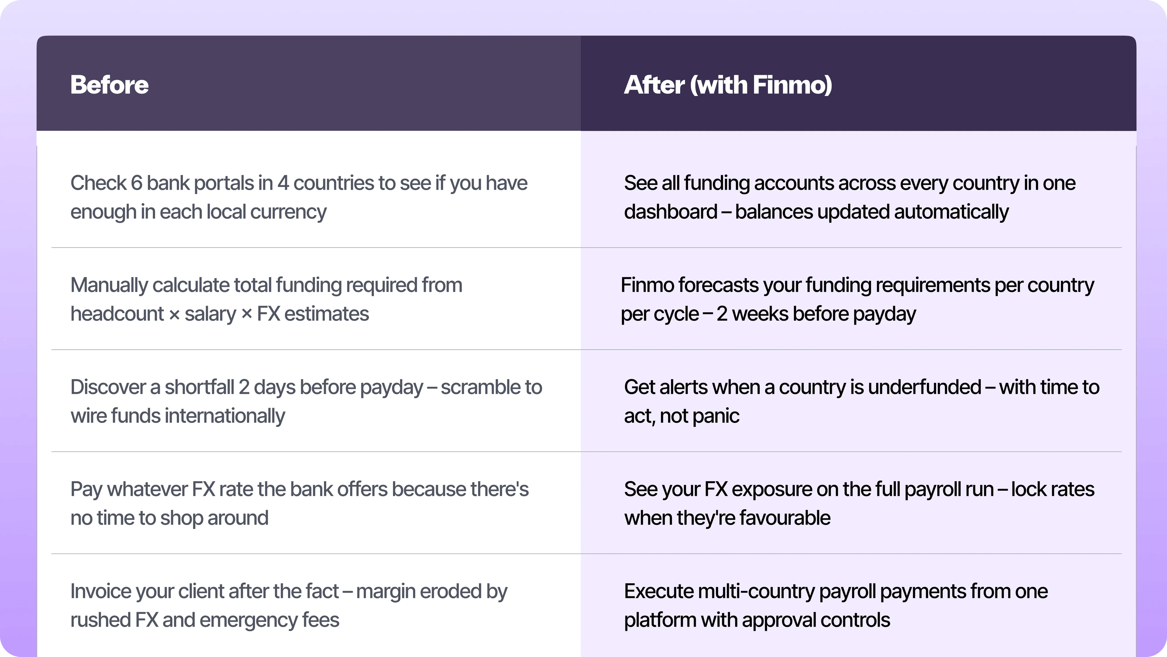 Running payroll across countries isn't a payments problem – it's a treasury problem. You need to know what's required, ensure it's funded, execute the payments, and prove it all to auditors. Finmo handles the full cycle.