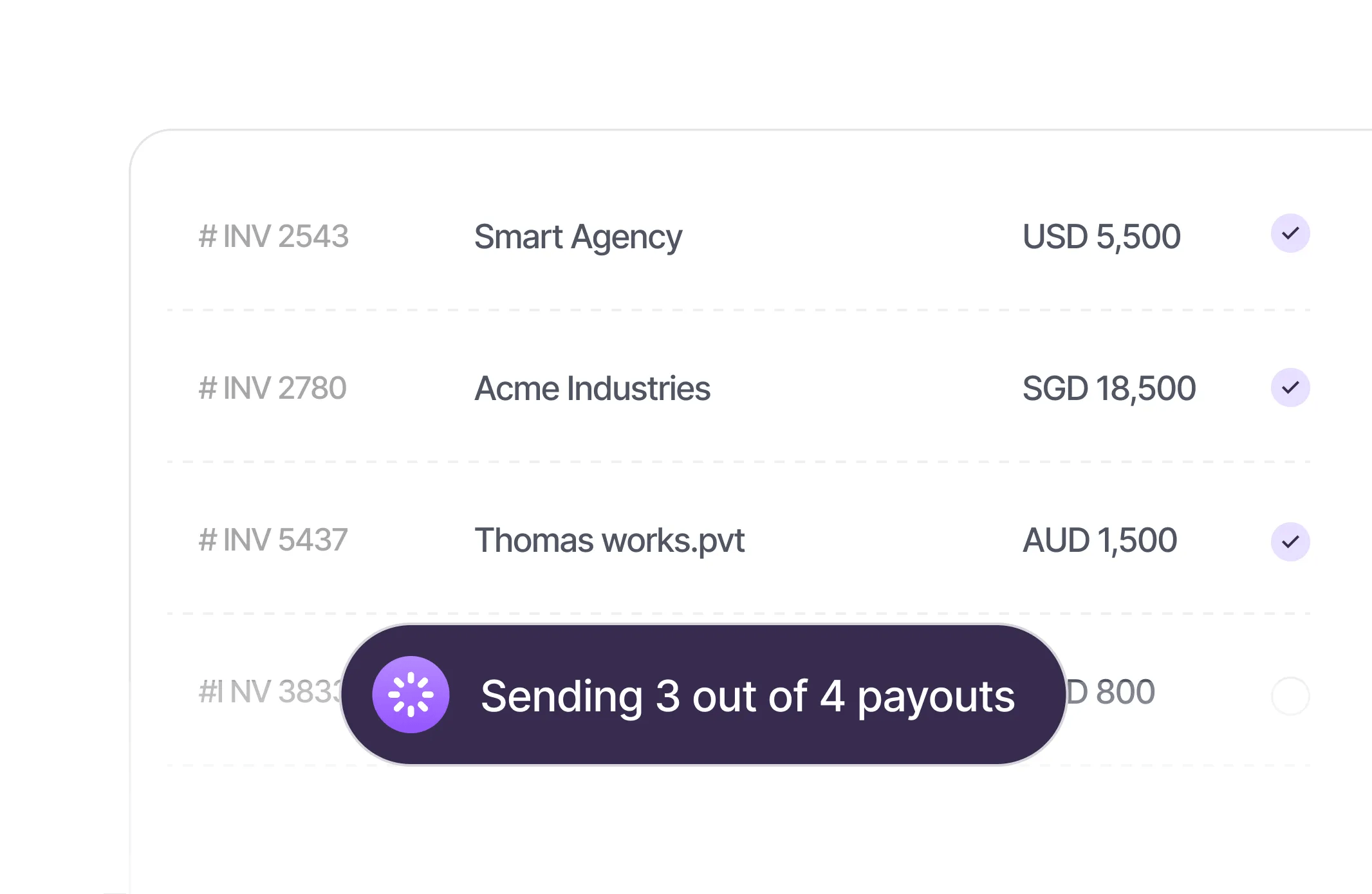 Upload your payee list. Set currencies and amounts. Execute batch payouts to 180+ countries.