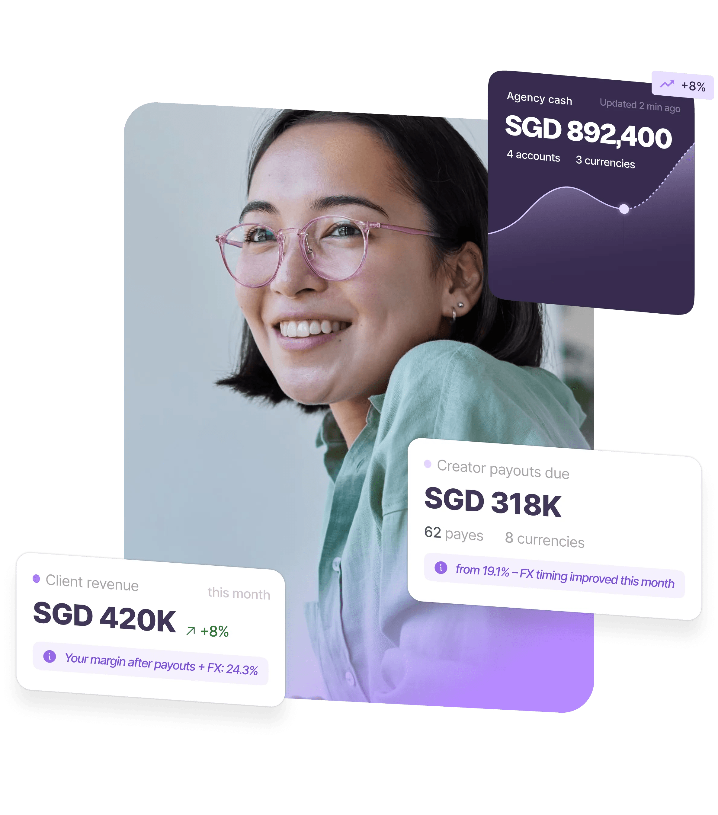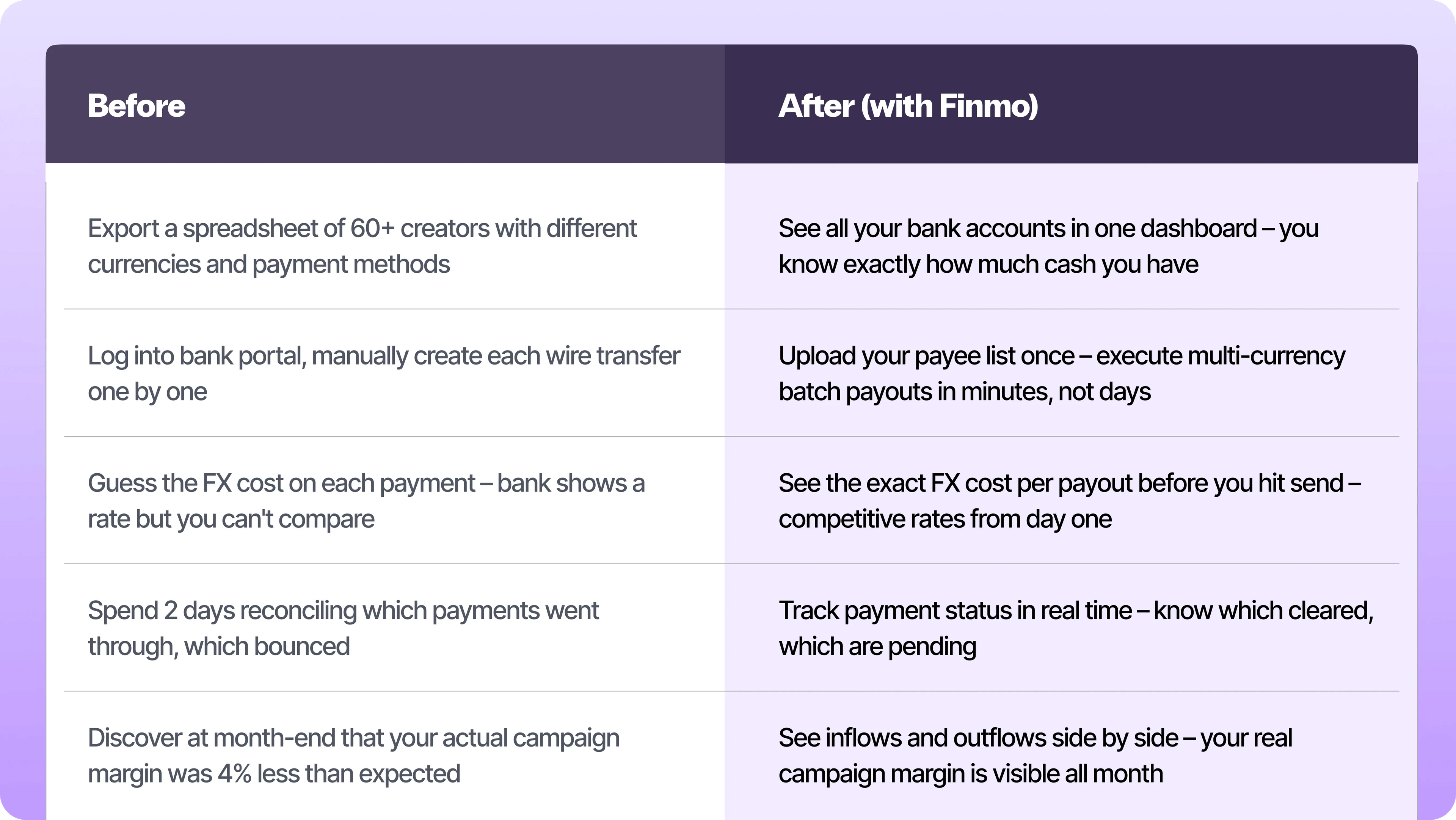 Client revenue lands in one currency. Creator payouts go out in twelve. Somewhere in between, your margin disappears. Finmo connects your accounts so you can see the full picture – inflows, outflows, and what's left – before the month closes