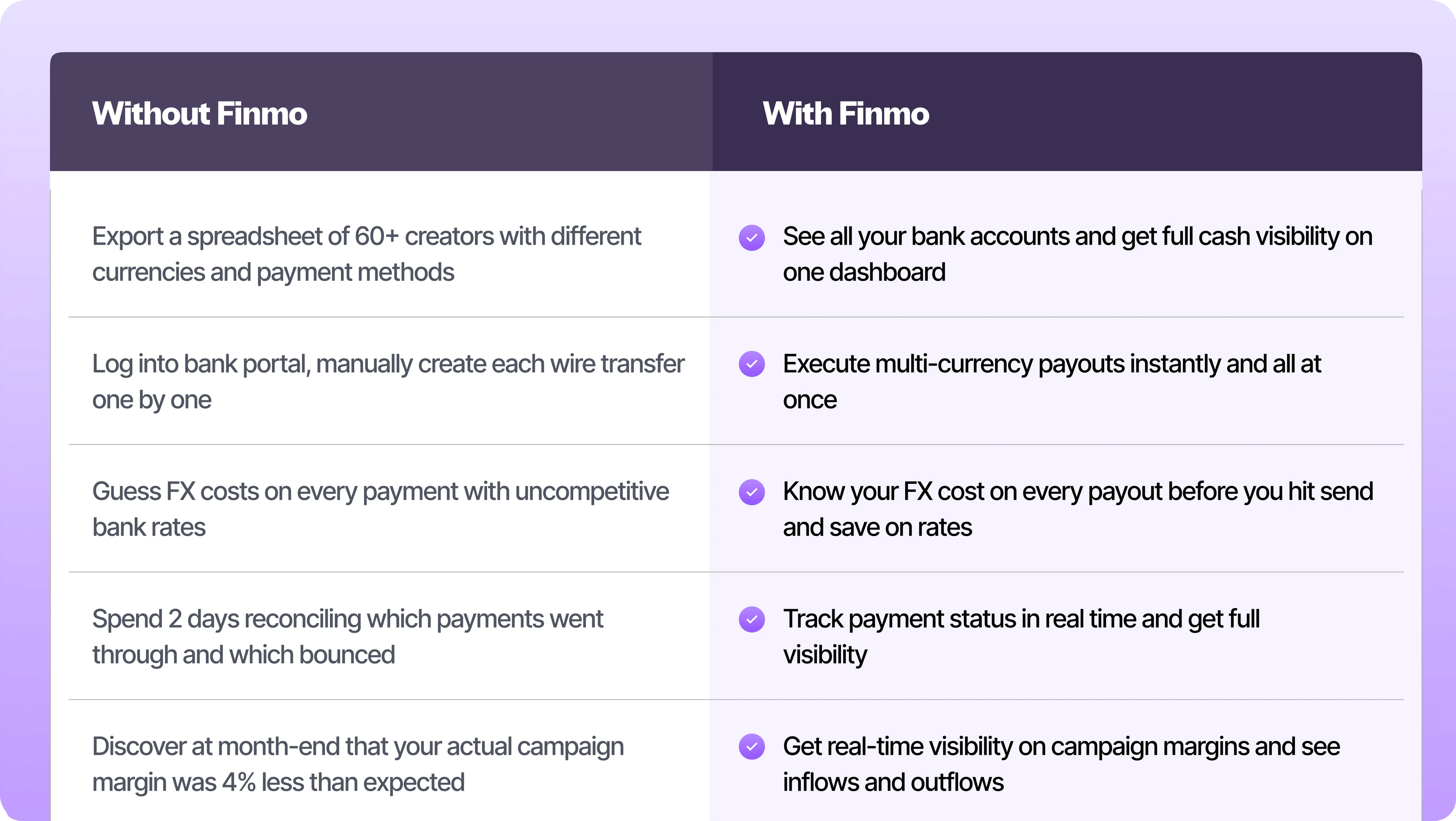 Most agencies manage client revenue and creator payouts in completely separate systems. Finmo connects both sides, so you can see your real margin in real time – not after the month closes.