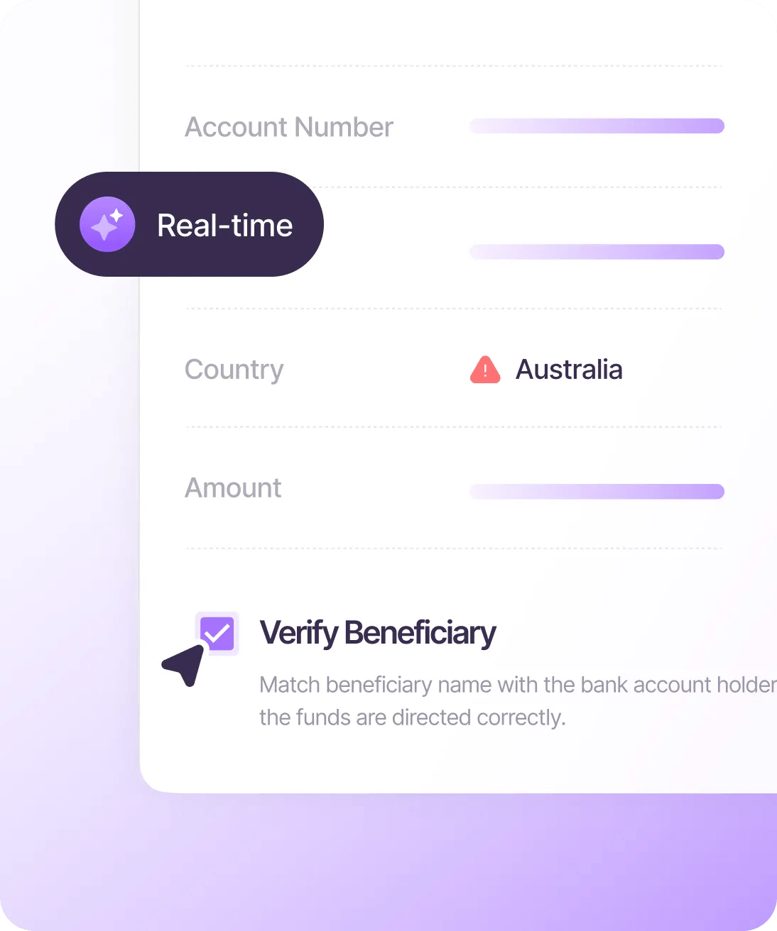 Receive real-time match outcomes including exact match, partial match, or no match. Identify minor spelling errors, incorrect entities, or mismatched beneficiaries, while staying compliant with regional regulations.