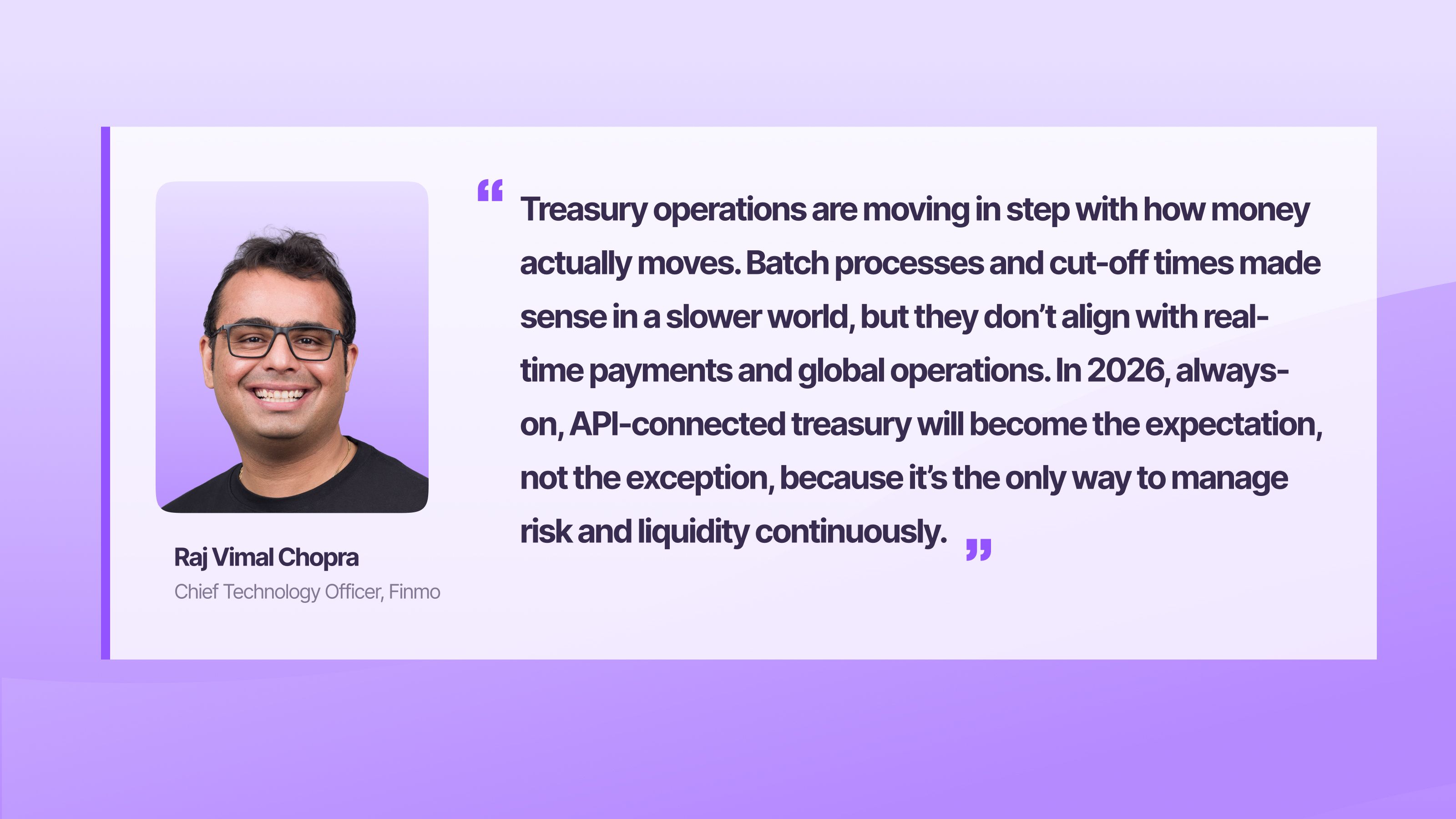In 2026, cross-border payments are moving toward an increasingly always-on state. Liquidity and exposures change throughout the day, not at the end. To keep up, treasury operations are becoming deeply API-connected, integrating banks, ERPs, payment providers, and FX platforms into a single operational flow.