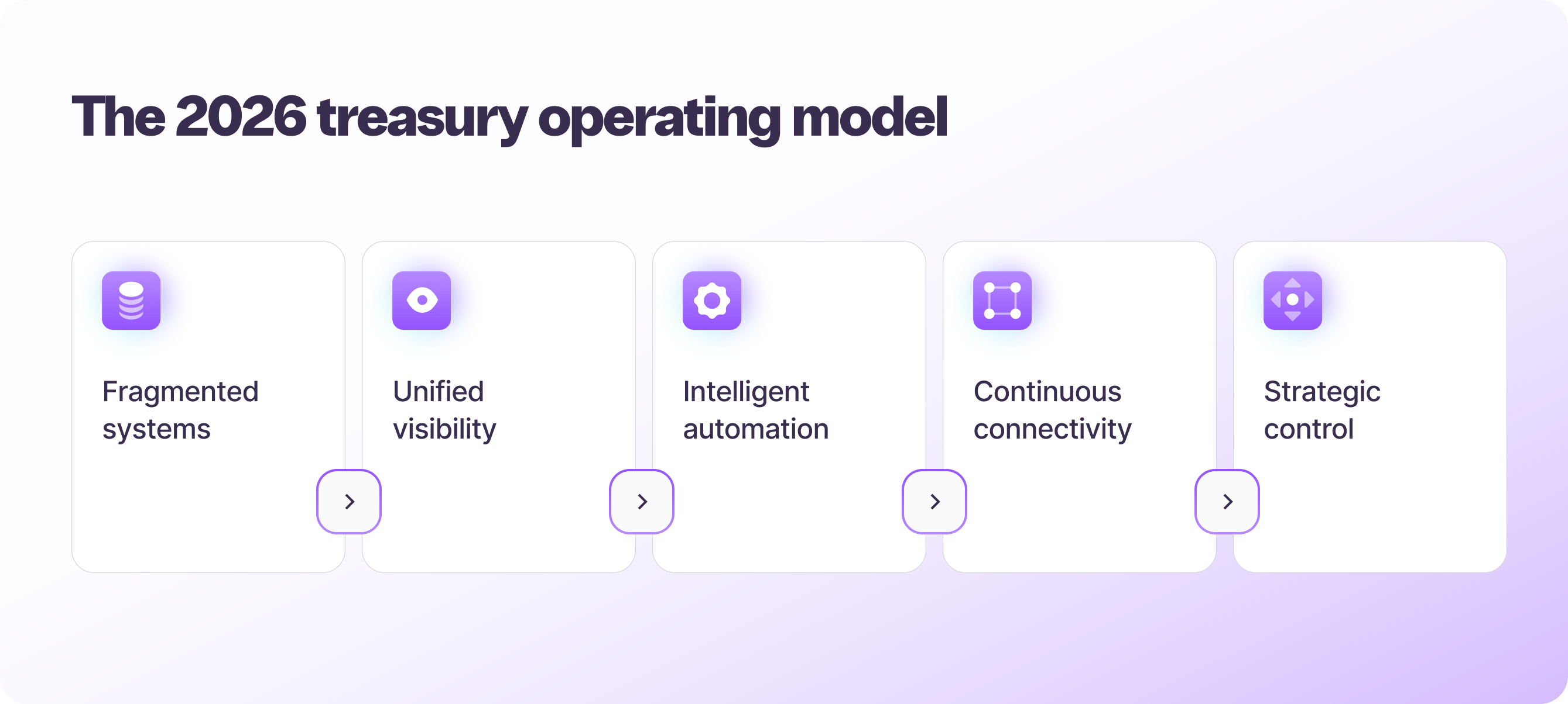 Global expansion, real-time payments, regulatory pressure, and ongoing volatility have fundamentally changed what CFOs need from treasury. Businesses now operate across more markets, currencies, and payment rails earlier than ever before, often with lean finance teams and little margin for error. In 2026, treasury can no longer function as a fragmented, reactive back-office operation. It must become a connected control layer that gives CFOs clarity, confidence, and control as the business scales.