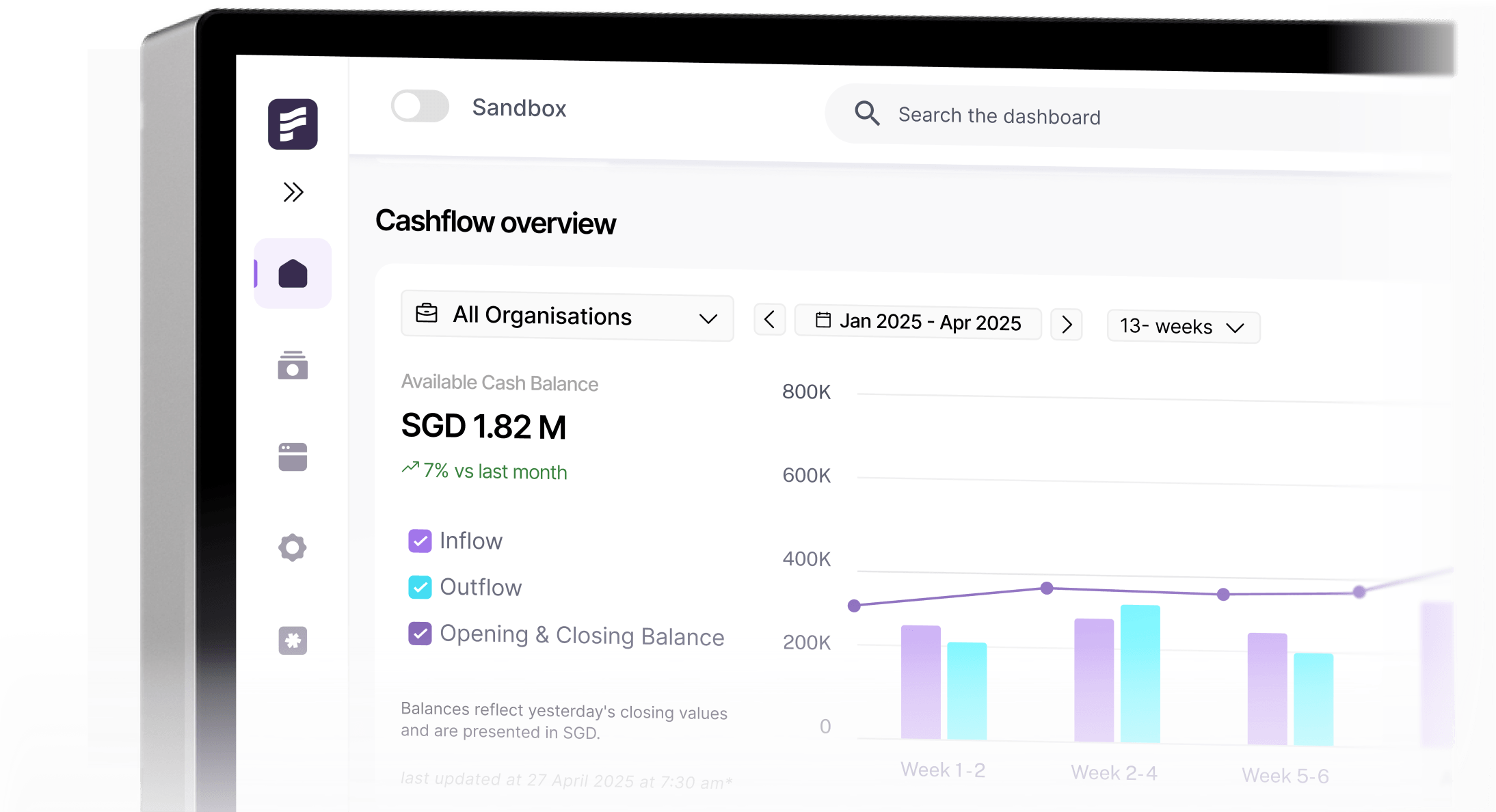 Stop switching between bank portals, spreadsheets, and payment tools. Connect your accounts, see your global cash position instantly, forecast runway in real time, and activate global payments when you're ready.